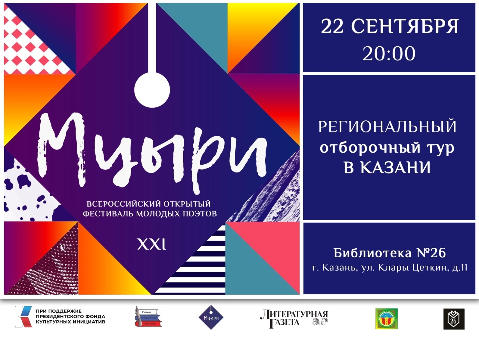 22 сентября в 20:00 в Библиотеке №26 ЦБС г. Казани состоится региональный отборочный тур XXI Всероссийского открытого фестиваля молодых поэтов «МЦЫРИ».